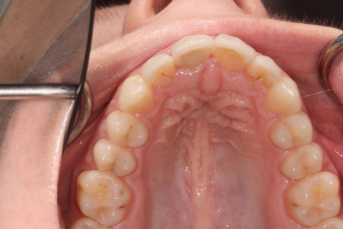 Emma had trauma to her front teeth as a small child. She had some dental work done as a teenager that was discoloring and needed it fixed to improve her smile. Her front tooth was very stained from an old root canal, which we had to cover up and mask. With 3 veneers and 1 crown we were able to straighten her front teeth, hide the stained teeth, and give her back her smile. We worked with our onsite lab for custom color matching here. We were able to be totally done with this case in 1 week from start to finish.