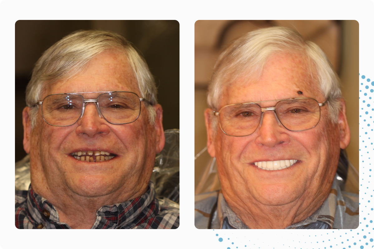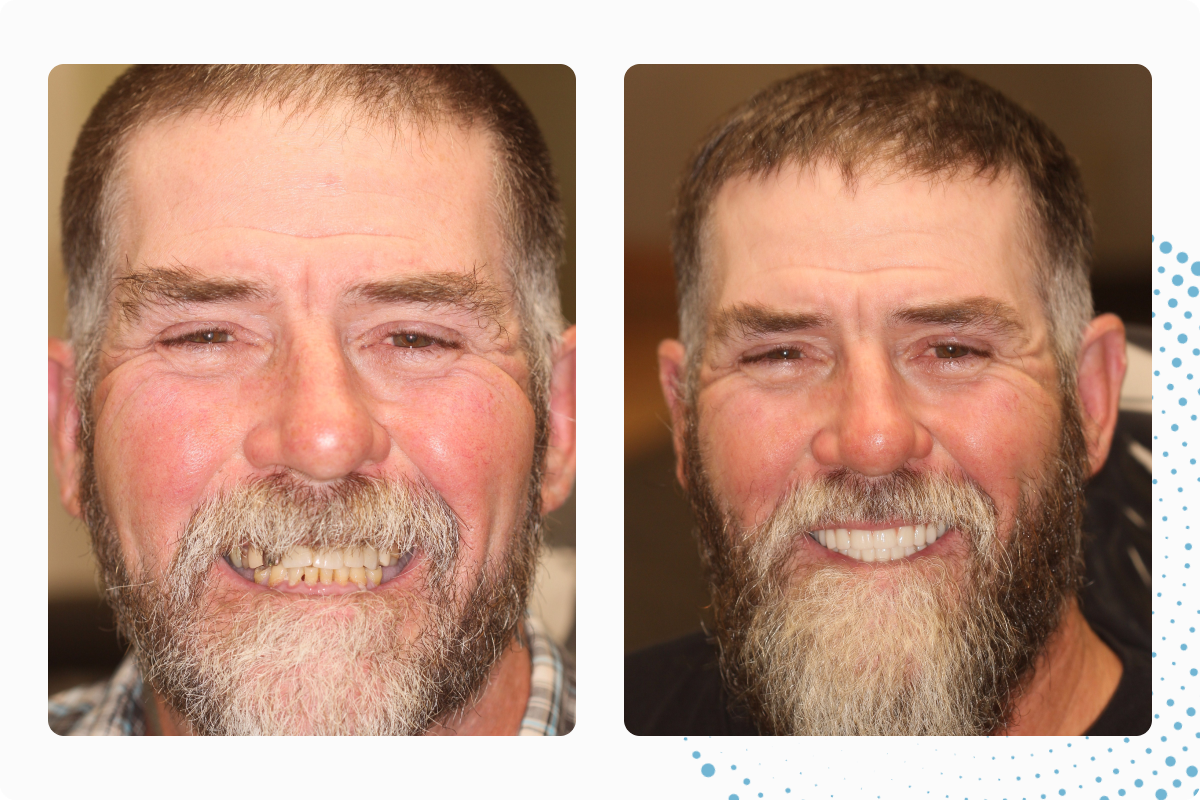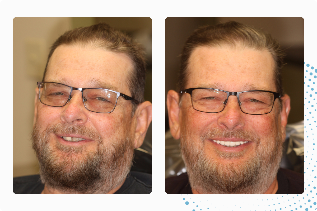 In 1 day we were able to completely redo his worn smile and missing teeth. He had struggled with broken teeth and grinding for decades. He feels like a new person now. There’s new confidence with his new smile.