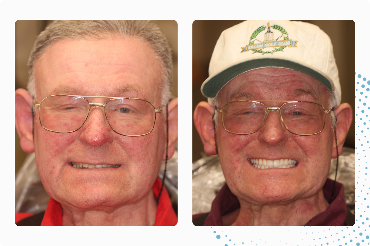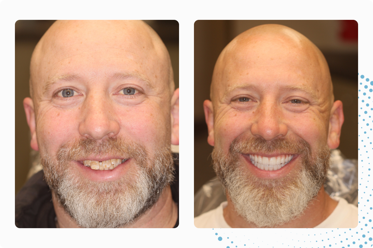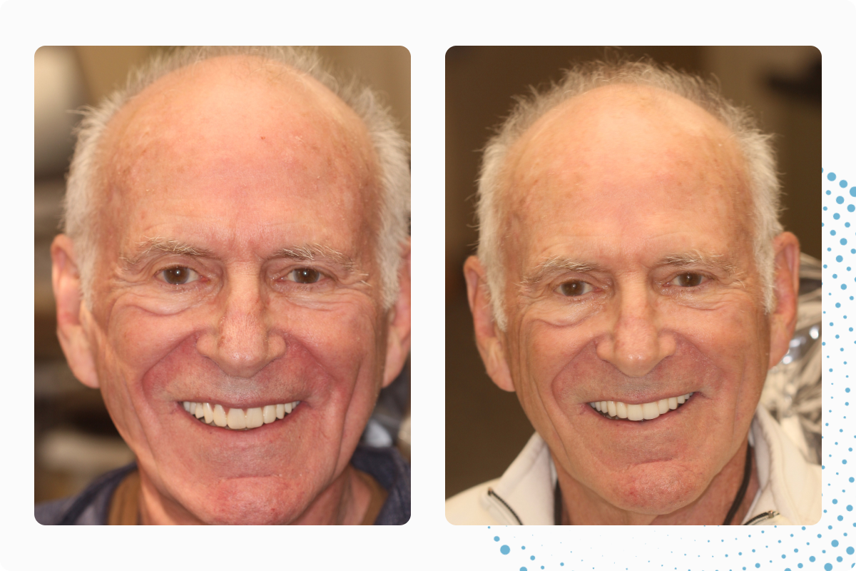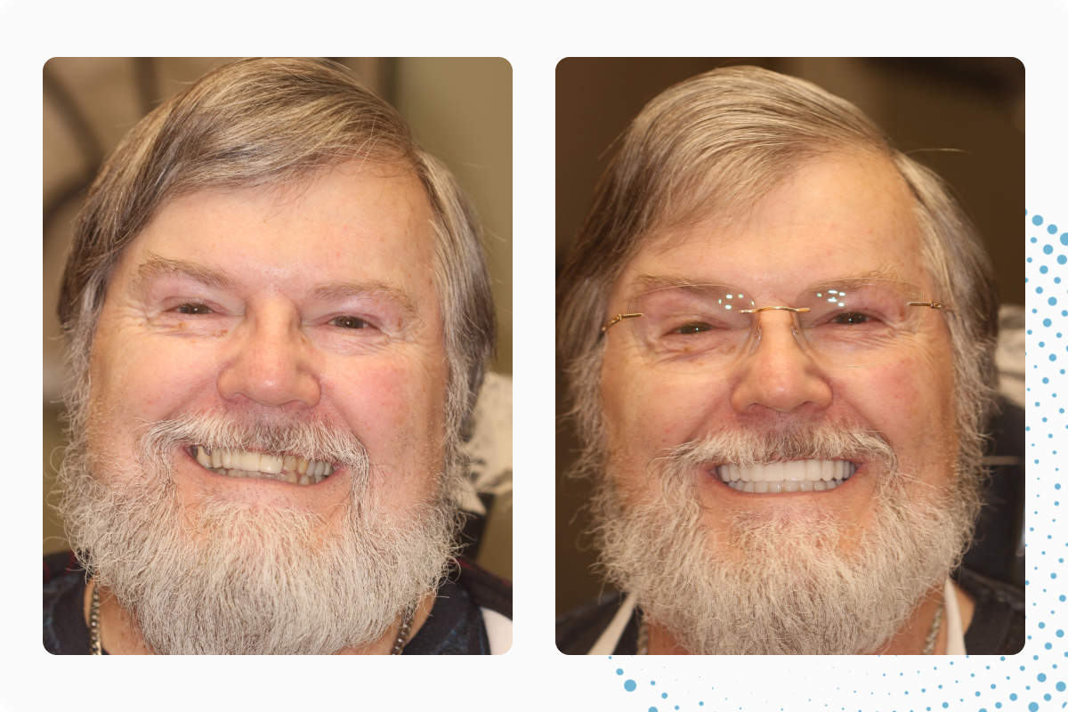 In 1 day we were able to completely redo his worn smile and missing teeth. He had struggled with broken teeth and grinding for decades. He feels like a new person now. There’s new confidence with his new smile.