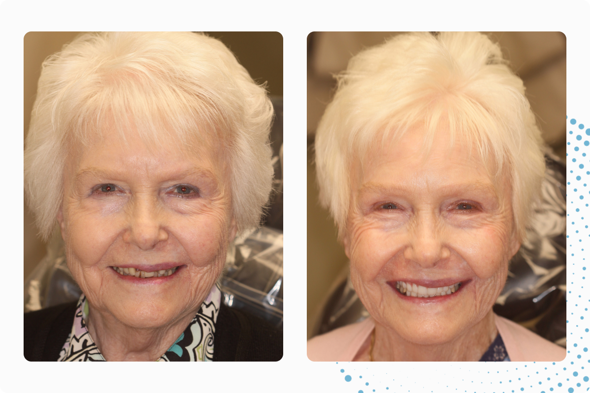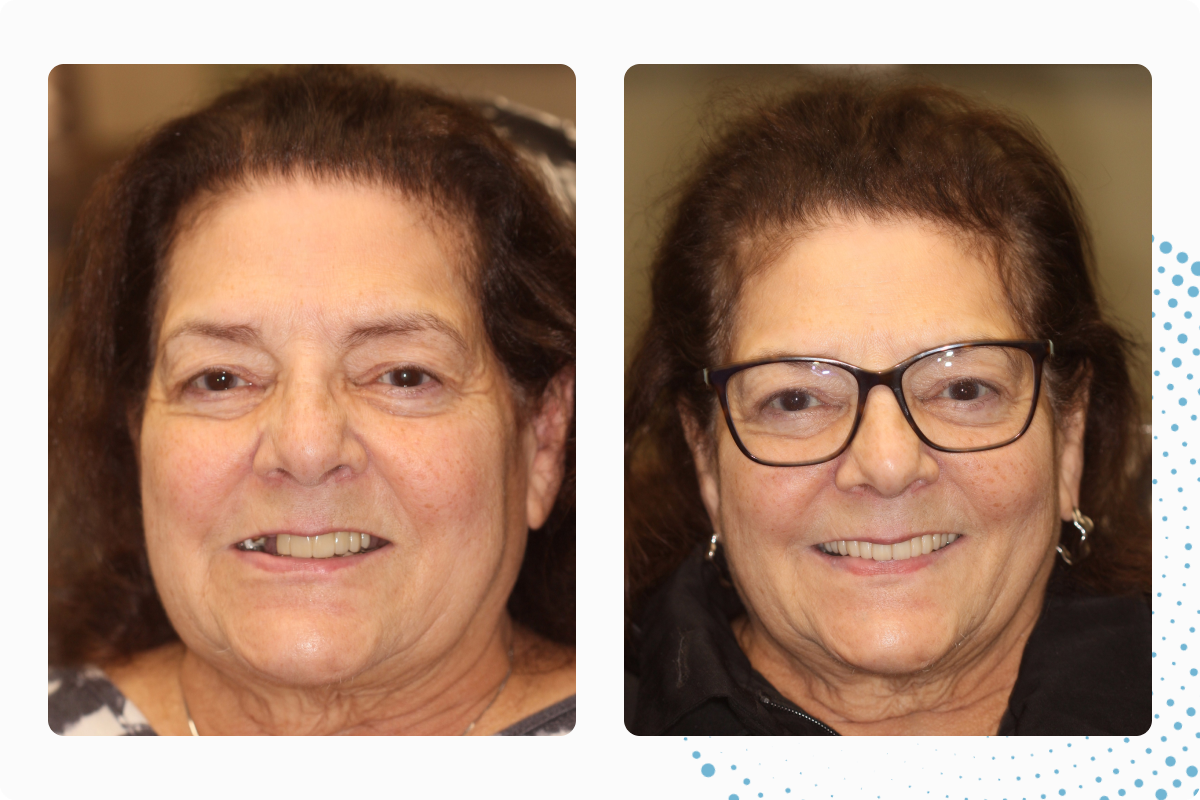 Barbara had broken teeth and old failing implants. She had lost hope. Other dentists did not know how to help her. With our Teeth in 24 we were able to give her a healthy, beautiful smile in a day. What a difference it has made in her life.